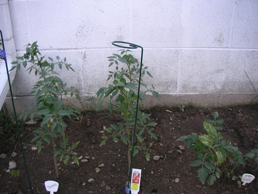 These are our 6 big tomato plants and one cherry tomato plant. Nobody really needs 6 regular-sized tomato plants, but our neighbor Bill gave us a sob story about how Anna refuses to plant them as she hates them and, unfortunately, he loves them. Notice from the earlier picture that they’re all the way in the back so he has easy access to sneak one on whatever occasion.