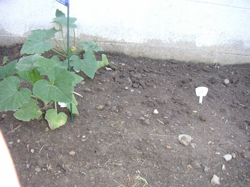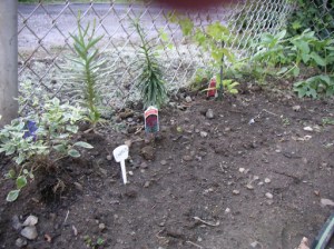 The plants on the left are zucchini and yellow squash. On the right are Lavender (in the back) and something I have suddenly forgotten.