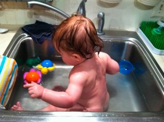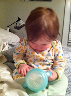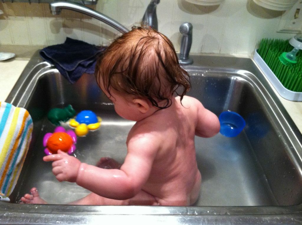 Lincoln is 8 months for April. He’s sitting up on his own, standing, pulling himself up, rolling ALL OVER the place, and he is soooo close to crawling. So close! At this point, though, he may just skip the crawling and move on to walking. He doesn’t have much patience for moving around on the carpet and he tends to either roll to get where he wants or he just likes standing.