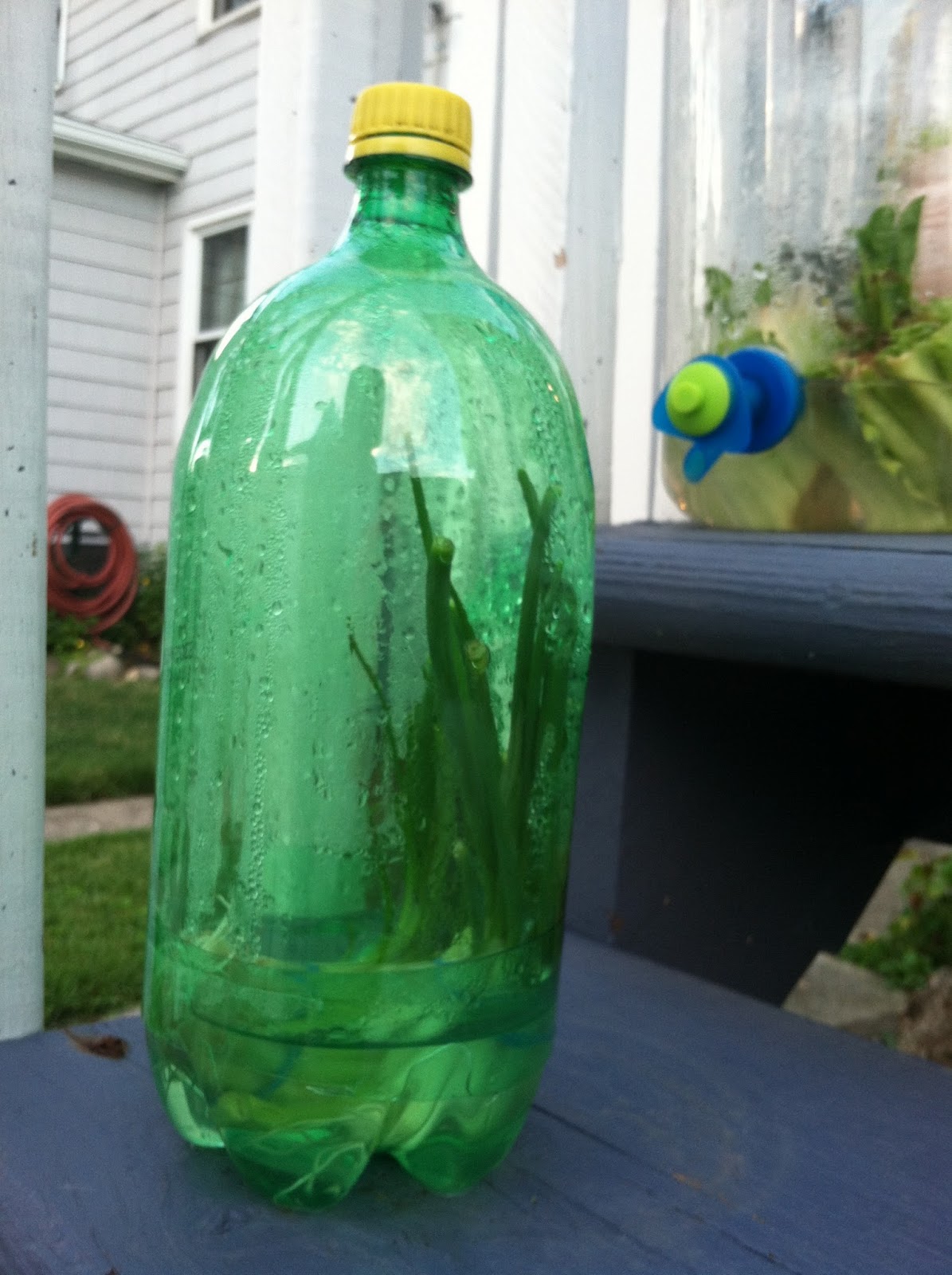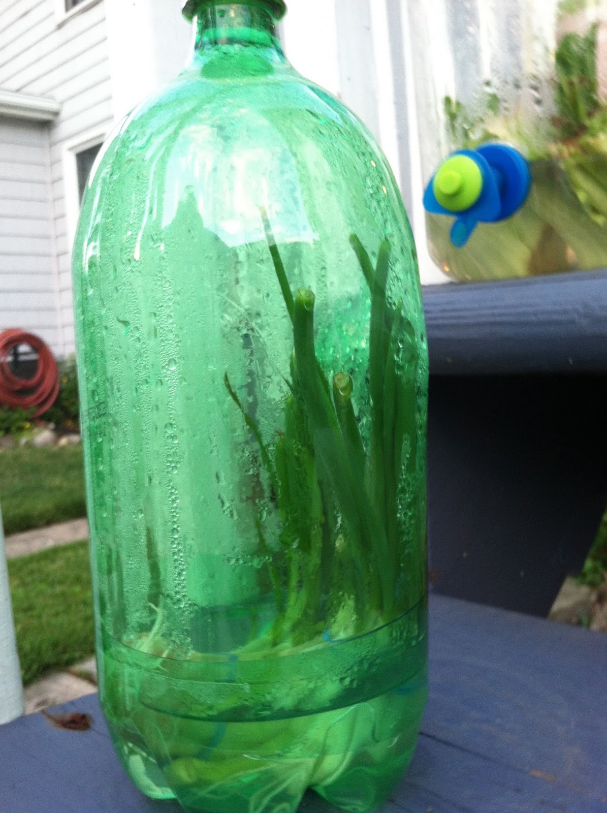 Oooh, this is cool. I saw this on Pinterest weeks ago and tried it out in my kitchen window. When you use green onions, you can save the bulbs, rubberbanded. Leave them in water to cover the bulbs and they shoot up like crazy in a matter of 2 WEEKS! After it worked once, and I ate my homegrown onions, I decided to get more and put them outside for some extra sun. Again, if I can get a greenhouse of decent size set up, these will be added. I love, love, love green onions.