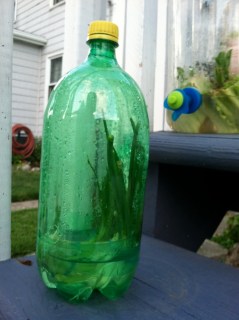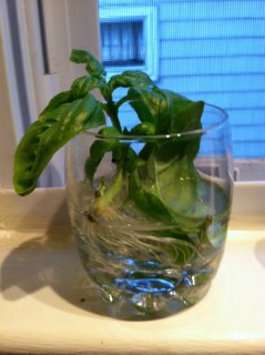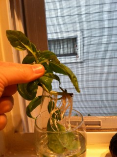 And here’s the remains of what was pinched off…a stem and an extra leaf I just couldn’t throw away. They’re both taking root in water. I picked up extra pots this week and plan to make some more starters. I may give them to friends for sharing.