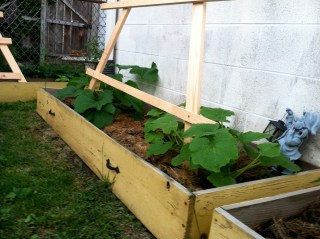 Below – Yellow squash to the right, Zucchini to the left. I’m seeing some blossoms. Christi made me an A-frame to try and encourage climbing. Usually the squash plans just take over the entire garden, so we’re trying something new I  found on Pinterest. The A-frame might not have been the best design for squash, but it’s all about trial and error.