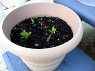 Here lies what is left of my precious Spinach. This poor guy was loaded with little spinach sprouts just over 2 weeks ago. But the *#$@ squirrels have been terrorizing all of my new plants especially anything I put in a pot this year. ARGH!!! These three sprouts survived and are trying to make their way. The squirrels are leaving them alone for now. I’m looking into putting a homemade greenhouse on the back porch and these may be put in there. If nothing else, I may just put a milk gallon jug over the top for a couple weeks.